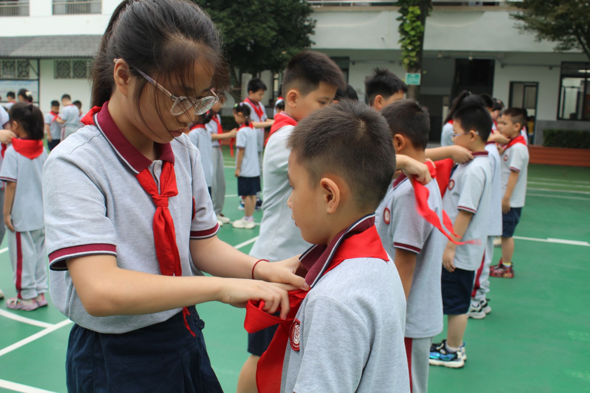 紧接着,最激动人心的时刻到了!五年级的队员代表们手持鲜艳的红领巾来到二年级新队员的面前为他们戴上,并将最好的祝福给予了二年级的弟弟妹妹们,新队员们回敬最标准的队礼!