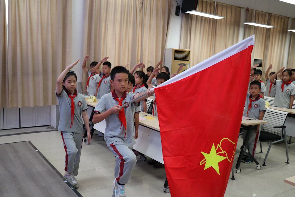 在激动人心的竞选演讲后,全体少先队员起立,面对队旗,重温入队誓词,进行庄严的呼号:“准备着,为共产主义事业而奋斗!”响亮的呼号声,是少先队员们对党和人民的庄严承诺,也是对未来学习生活的美好憧憬。伴随着悠扬的音乐,退旗仪式缓缓进行。护旗手们再次登场,将队旗缓缓收起,标志着本次大会的圆满结束。虽然仪式结束,但少先队员们心中的火焰永不熄灭,他们将继续在学习和生活中发光发热,传承红色薪火。