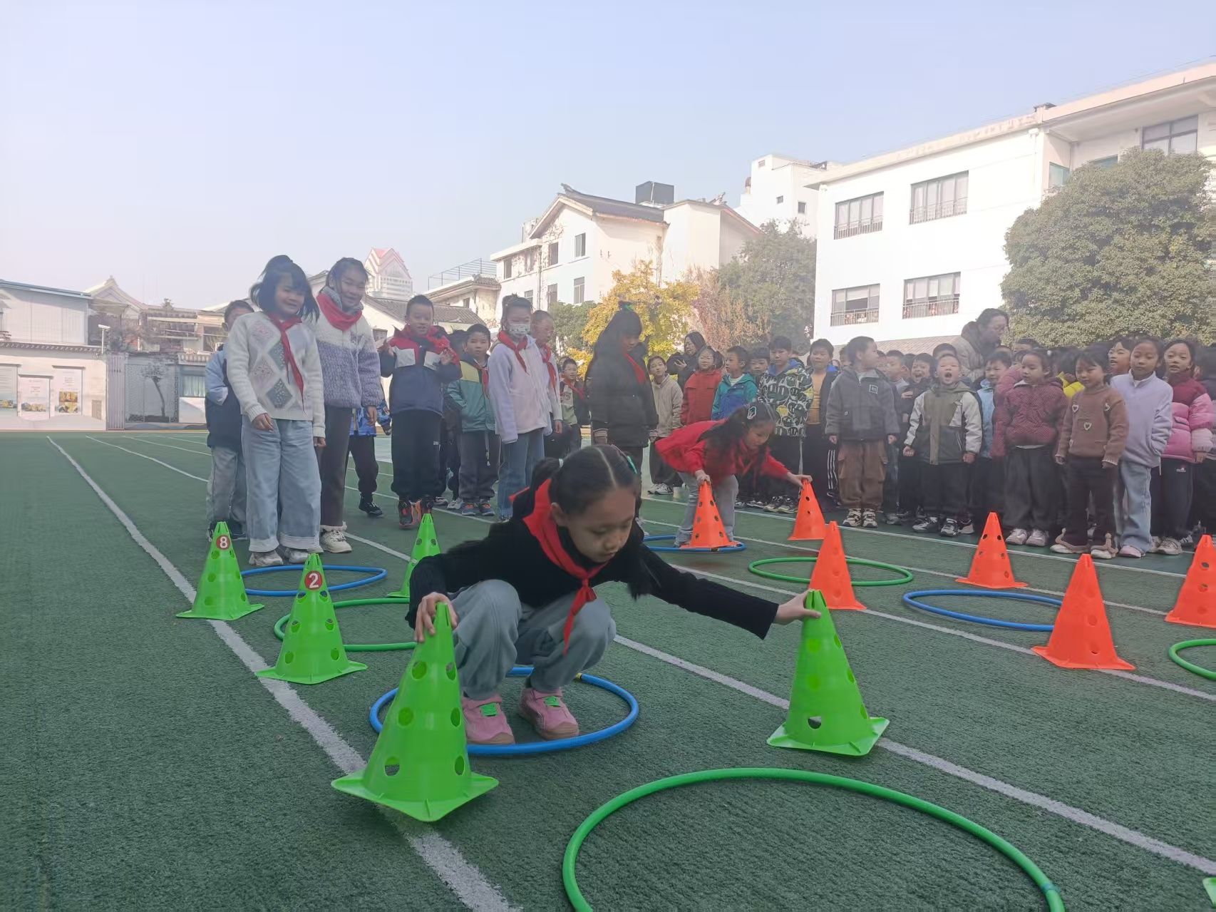 低年级的套圈接力赛场堪称“萌娃欢乐营”。只见小选手们身着鲜艳运动服,像一群灵动的小精灵。比赛开始前,他们踮着脚尖打量目标,小手紧紧攥着彩色套圈,眼神专注又认真。“嘟——”哨声响起,第一位小朋友迅速冲刺到套圈点,瞄准目标轻轻一抛,套中啦!赛场立刻响起阵阵欢呼。他们来不及庆祝,抓起接力棒就向队友飞奔而去,小小的身影在跑道上穿梭,偶尔有人不小心摔了个“屁股墩”,也立刻爬起来拍拍尘土继续前行,脸上挂着汗珠却笑容灿烂。班主任们在跑道旁弯腰护航,时而轻声鼓励,时而伸手搀扶,“慢点跑,注意安全”“没关系,加油呀”的温柔话语,成为孩子们最坚实的后盾。场外家长们举着手机记录瞬间,忍不住为萌娃们的执着呐喊助威,笑声与掌声交织成最动听的童年乐章。